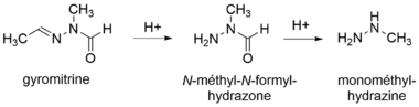 L’hydrolyse de la gyromitrine conduit à deux métabolites : la N-méthyl-N-formylhydrazine (MFH) et la monométhylhydrazine (MMH). La MFH est dégradée lors du séchage, mais il reste la MMH, très toxique, qui résiste à la cuisson. Lors de la consommation de gyromitres, le syndrome gyromitrien peut entraîner le décès. Les symptômes sont variés : troubles digestifs, troubles neurologiques tels que des convulsions et troubles hépatiques.