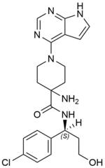 n. m.  (DCI). Petite molécule de synthèse dérivée de la pyrrolopyrimidine, qui est un puissant inhibiteur compétitif de l’adénosine triphosphate (ATP), cofacteur de la fonction de phosphorylation par la sérine – thréonine kinase AKT (protéine kinase B), et qui inhibe ainsi toutes les isoformes de l’AKT (AKT1, AKT2 et AKT3).