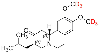 n. f.  (DCI). Médicament du système nerveux central, analogue structural hexadeutéré de la tétrabénazine (6 atomes de deutérium sur les deux groupes méthoxyles). Son mécanisme d’action est encore imprécis (déplétion réversible des monoamines comme la dopamine, la sérotonine ?). Le développement de ce médicament deutéré est basé sur le concept de l’effet isotopique lié à la présence d’atomes de deutérium. En effet, du fait de la masse atomique plus élevée du deutérium comparativement à celle de l’hydrogène, la coupure de la liaison carbone - deutérium est plus difficile, d’un point de vue énergétique, que celle de la liaison carbone - hydrogène. Ceci est directement applicable à l’oxydation des groupes méthyles via les cytochromes P450, où le métabolisme oxydatif serait plus lent avec les composés deutérés qu'avec les composés hydrogénés. Il en résulte des modifications pharmacocinétiques pour la deutétrabénazine, comparé à la tétrabénazine : les métabolites actifs deutérés ont des demi-vies deux fois plus longues que leurs analogues hydrogénés. Il est donc envisageable de diminuer les doses et d’obtenir ainsi un meilleur index thérapeutique.