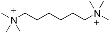 n. m.  (DCI). Dérivé de l'hexane substitué à chaque extrémité par un ammonium quaternaire, prototype des bloqueurs ganglionnaires non dépolarisants qui agissent en occupant les sites de fixation postsynaptiques de l'acétylcholine, provoquant (par levée du tonus adrénergique) vasodilatation et hypotension, diminution du débit sanguin rénal et du débit de filtration glomérulaire, diminution des sécrétions gastriques et salivaires, de la motilité intestinale et perte partielle d'accommodation.