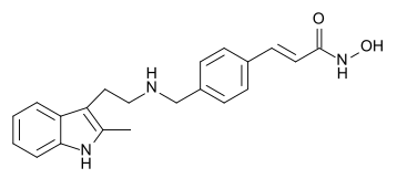 n. m. (DCI). Premier médicament d’une nouvelle classe d’agents antitumoraux ou néoplasiques, les inhibiteurs des histone désacétylases (HDAC). Les HDAC catalysent l’élimination des groupements acétyle des résidus de lysine des histones. L'inhibition de l'enzyme se traduit par une hyperacétylation des histones, altération épigénétique qui provoque un relâchement de la chromatine entraînant une modulation de l'expression des protéines du cycle cellulaire et induit un arrêt du cycle cellulaire et l’apoptose. Le panobinostat montre davantage de cytotoxicité sur les cellules tumorales que sur les cellules normales. Il empêche la croissance des plasmocytes tumoraux et réduit le nombre de cellules malignes. Il est également un substrat de la P-glycoprotéine, impliquée dans les processus de chimiorésistance.