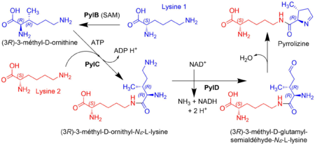 n. f. Acide α-aminé rare formé à partir de deux molécules de lysine, identifié presque exclusivement chez certains archées méthanogènes dans des enzymes spécifiques à leur métabolisme, notamment des méthyltransférases.