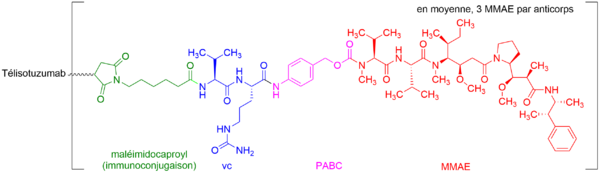 n. f. (DCI). Immunoconjugué qui est conçu en couplant l’anticorps monoclonal humanisé, le télisotuzumab, immunoglobuline G1-kappa (IgG1-κ), dirigé contre l’antigène associé aux tumeurs (AAT) et le proto-oncogène, récepteur tyrosine kinase c-Met [(c-Met ;MET ; récepteur du facteur de croissance hépatocytaire ; HGFR ; carcinome papillaire à cellules rénales 2, RCCP2)], avec la monométhyl auristatine E (MMAE), petite molécule perturbatrice des microtubules et cytotoxique, à l’aide d’un coupleur de type maléimidocaproyl-valyl-citrullinyl-p-aminobenzyloxycarbonyl (mc-val-cit-PABC) clivable par une protéase. La partie vc-MMAE est dénommée védotine).